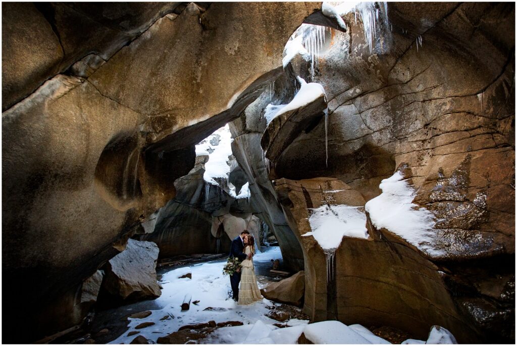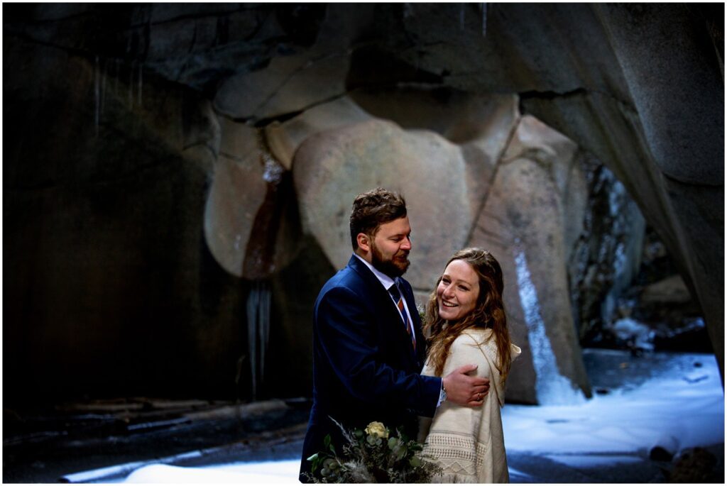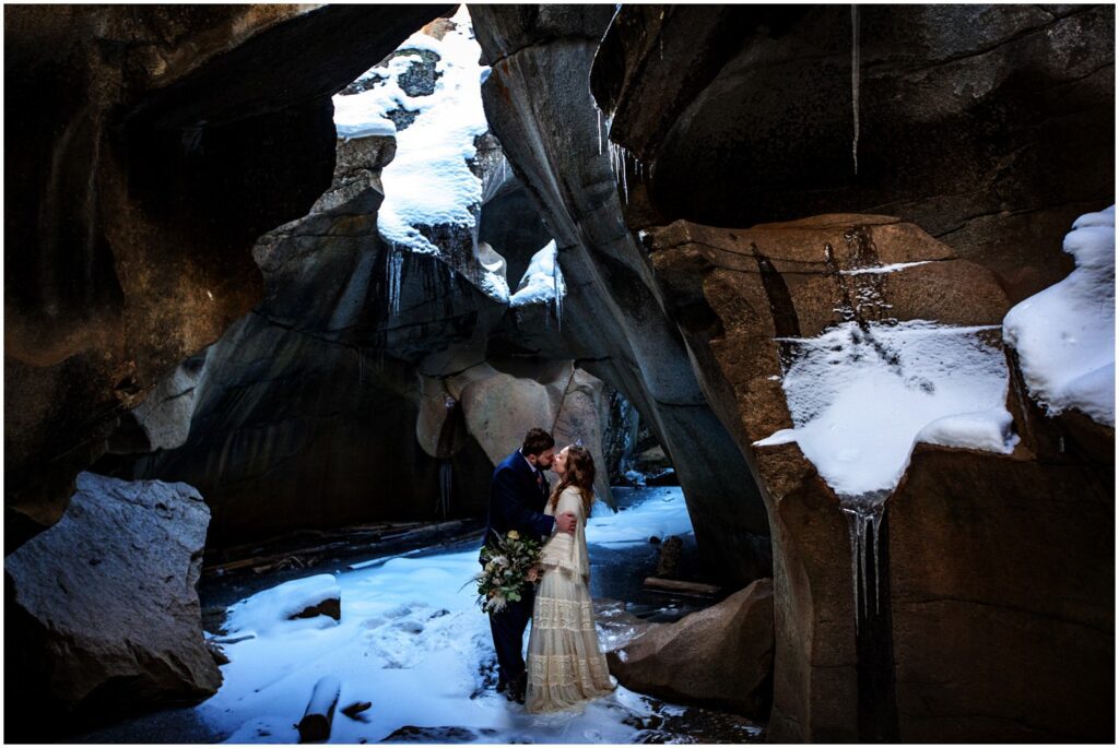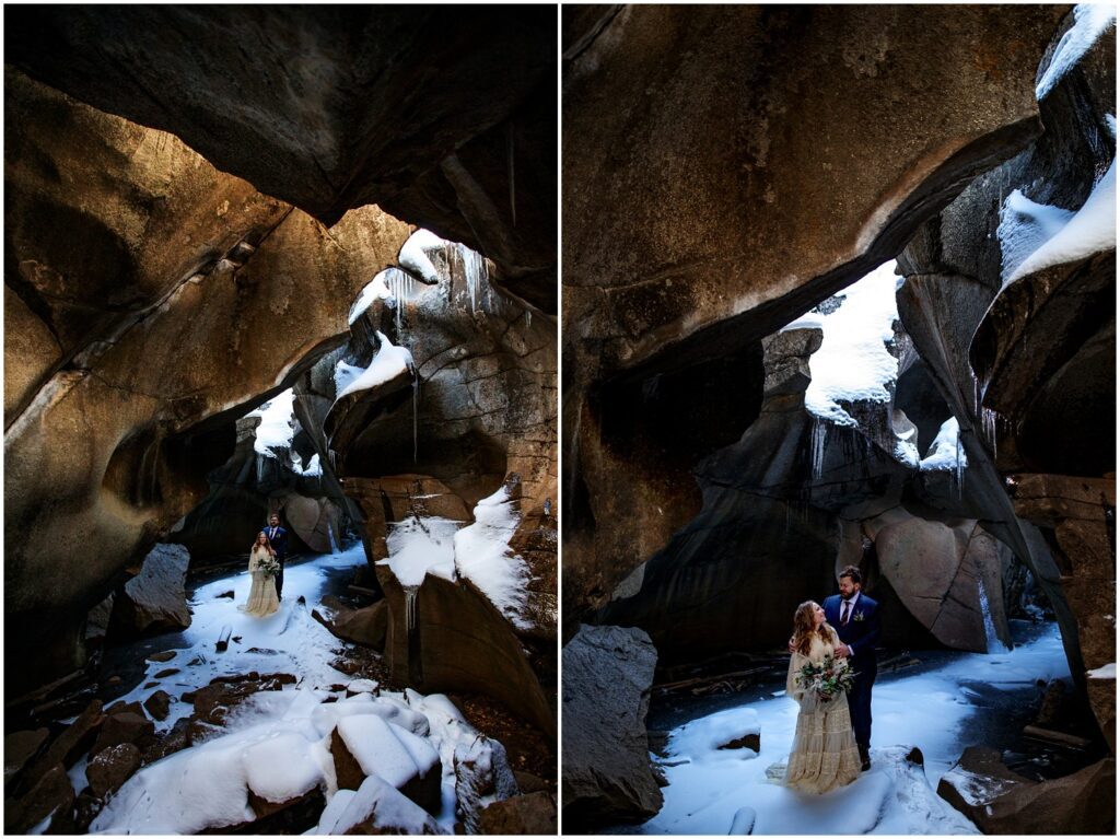 A nearby hike that has always piqued my interest is The Grottos and Ice Caves – located just off of Independence Pass on the Aspen side. The three of us headed out on our snowy hike to climb down into the Ice Caves for some photos. I’ve learned another very valuable lesson this year – bring your microspikes regardless if you think they’ll stay in your bag. There was only one spot – climbing down into the caves – that spikes were warranted – but hot damn was it slick. I may have went flying onto my ass on my way down.
