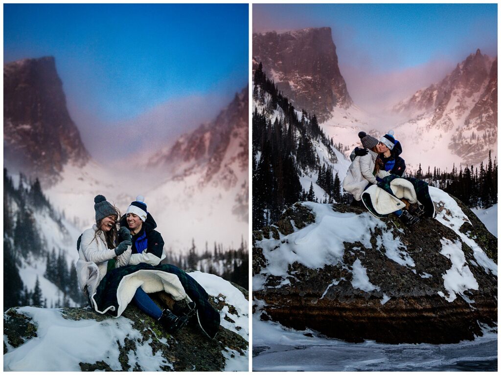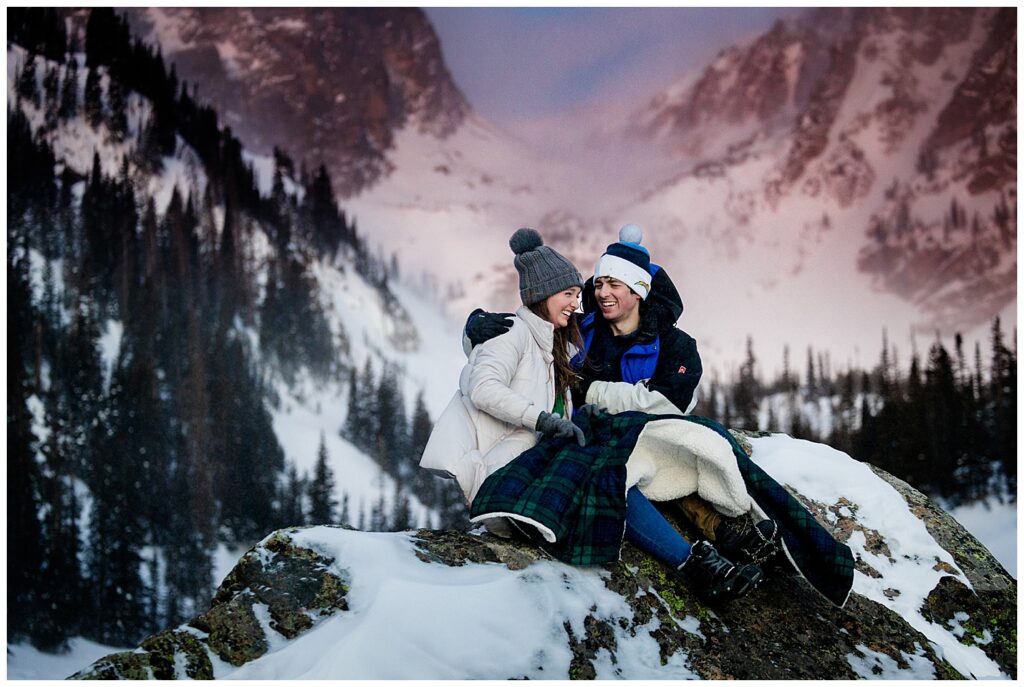 Winter mornings are very likely to include wind. Lots and lots of wind. This was definitely the case the day that Erin, John, and I hiked up to Dream for their portraits. Luckily, they came prepared with blankets and puffy coats. That being said – we hung out at the lake for a limited amount of time and then decided to seek lower ground. It’s been my experience that once you dip down below the final ascent up to Dream, the winds die down and the temperatures increase drastically.