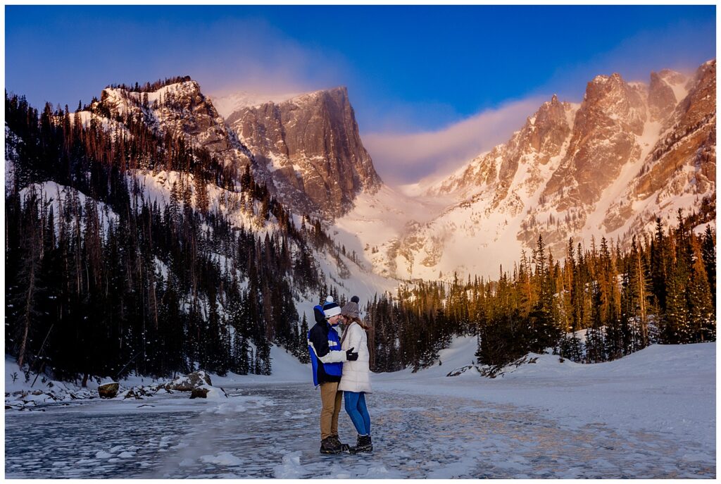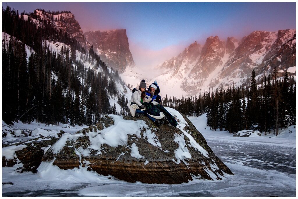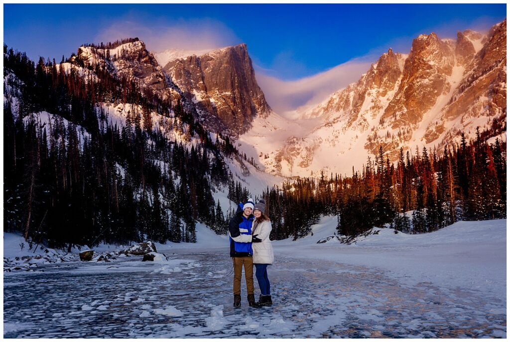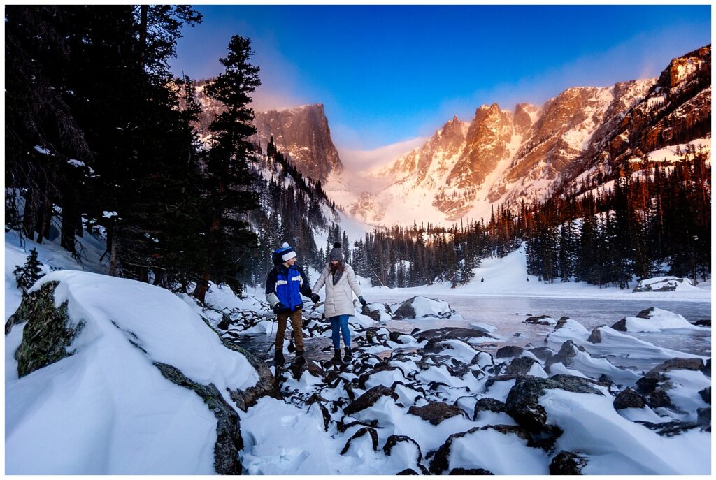 In my (not so) humble opinion, I think that Sunrise is where it’s at when it comes to portraits at Dream Lake. The sun hits the opposite horizon and lights up Flattop Mountain and Hallett Peak in stunning reds and pinks. Winter lighting is very mild regardless of the time of day due to the sun staying closer to the horizon line – meaning mid-day portraits are also very doable and likely to be significantly warmer.