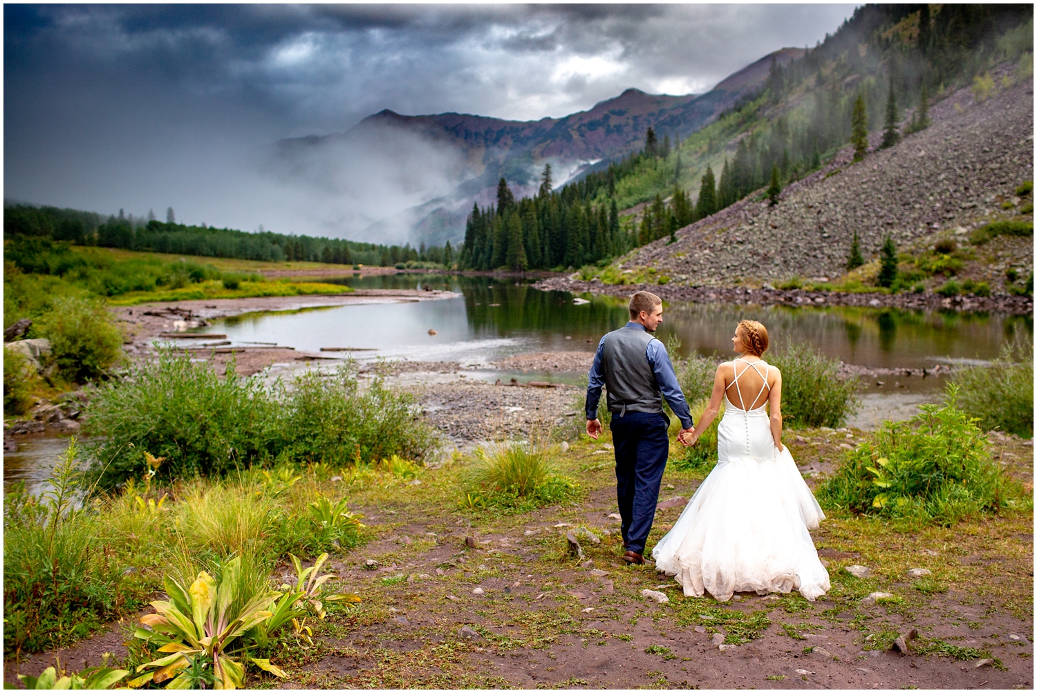 Kendra and Nelson’s elopement amongst the mountains was a typical Colorado day – filled with sunshine, wind, rain, and fog. 😬 . Our weather likes to live up to it’s reputation… CRAZY. During the vows, the wind kicked up off Maroon lake and took Kendra’s cathedral length veil with it. But like any good gentleman would, Nelson promptly ran after the veil and made sure that everything was just as Kendra wanted for her mountain ceremony. While they walked in the Snowmass wilderness, the sky darkened, the fog rolled in, and the rain began to come down. Over the years, one of my very favorite “emergency” items to carry has become a clear umbrella. I believe that they make for such lovely rain photos.