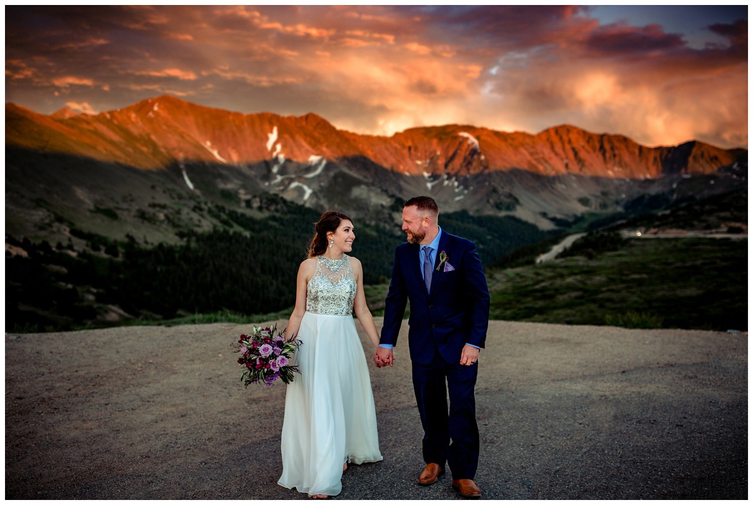We began on the Southfacing ridge, and made our way across to the Northwest side of the ridge as the sun began to crest over Hagar Mountain. The look of light falling behind a mountain and giving off a glow as it crests is one of my absolutely favorite things to photograph. I think the light is so dramatic and beautifully bold. On the night of Esslie and Nathan’s Colorado elopement, we sure caught a light show. The sun would hit behind the ridge, and we’d slightly ascend up the trail to catch the light from a slightly higher angle until daylight faded. Throughout our phone conversations, I had told Esslie and Nathan about Alpenglow, and that Loveland Pass is unique in the fact that you can catch the pink colors at sunset due to the Eastern facing mountainsides. Colorado did not disappoint – the entire East Humboldt Mountain Range turned amazing colors of pink and red.