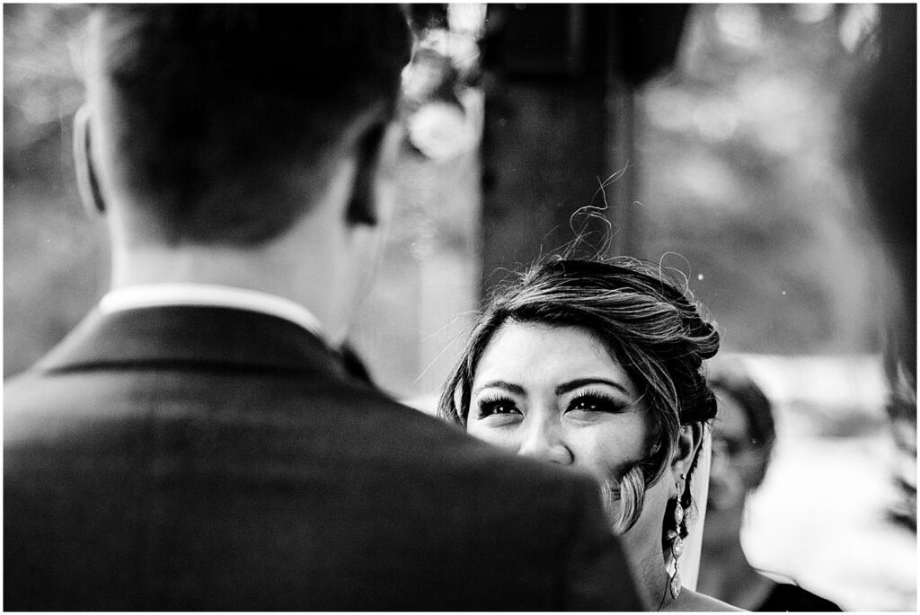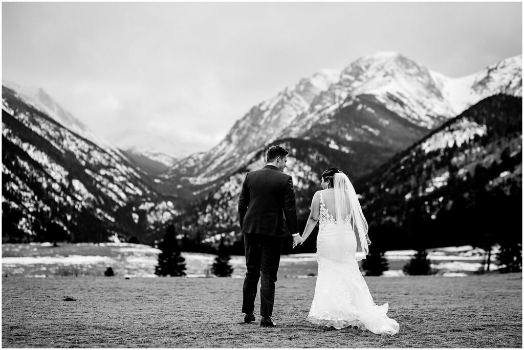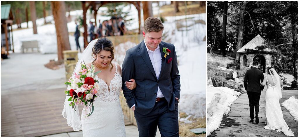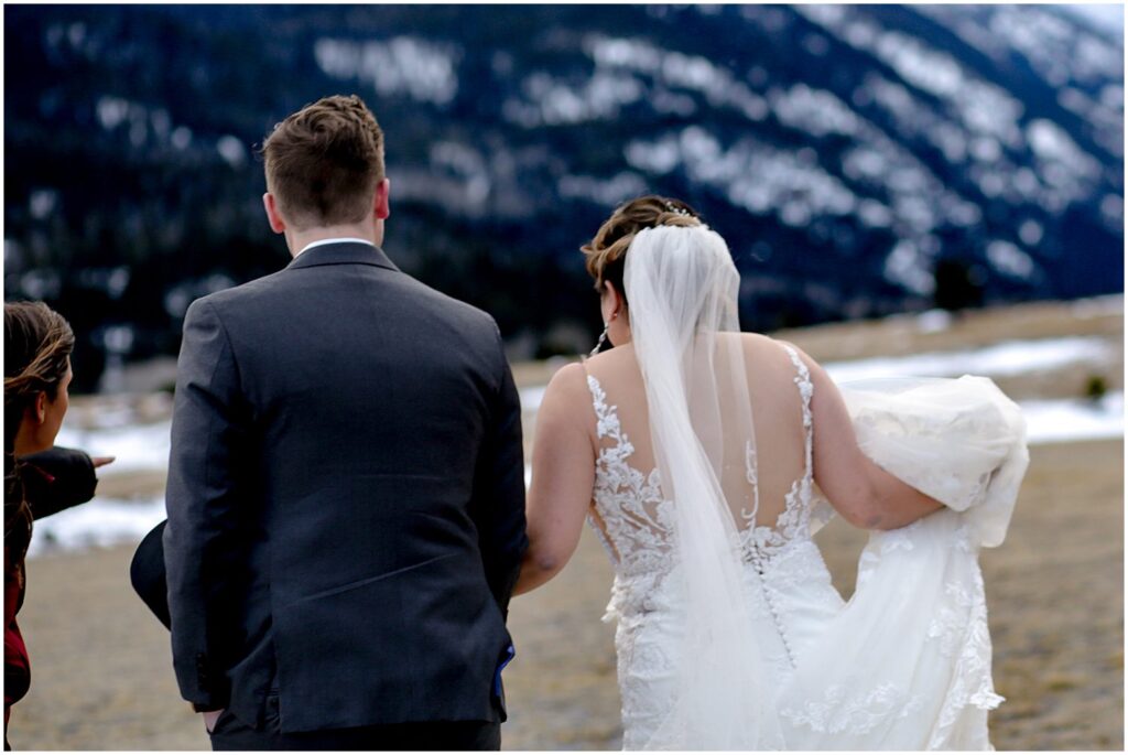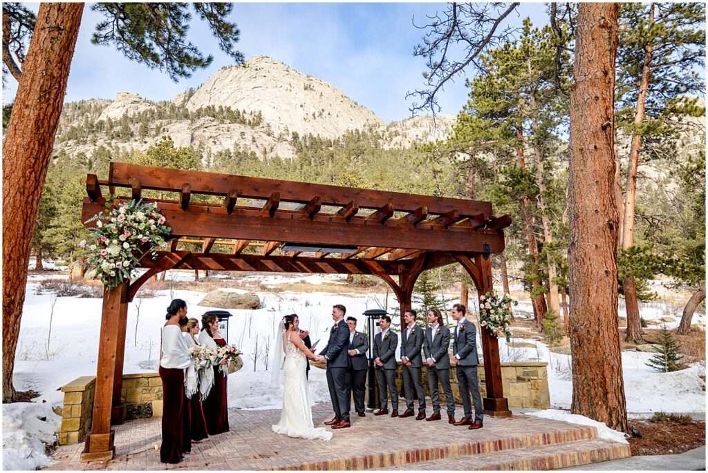 The beautiful landscapes of Rocky Mountain National Park are an amazing place for couple’s portraits, and the close proximity to Della Terra makes traveling there for photos incredibly accessible. However, the weather in the mountains can be unpredictable, particularly in the winter months. Prior to the ceremony, the skies were cloudy and the mountain views the Park is best known for were blocked by low-lying clouds.