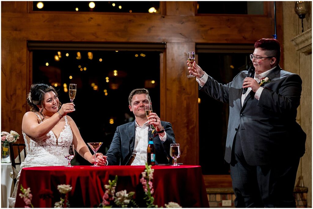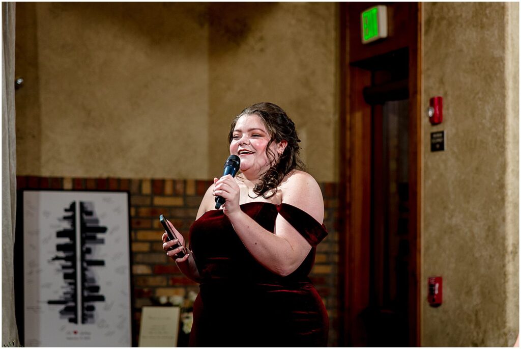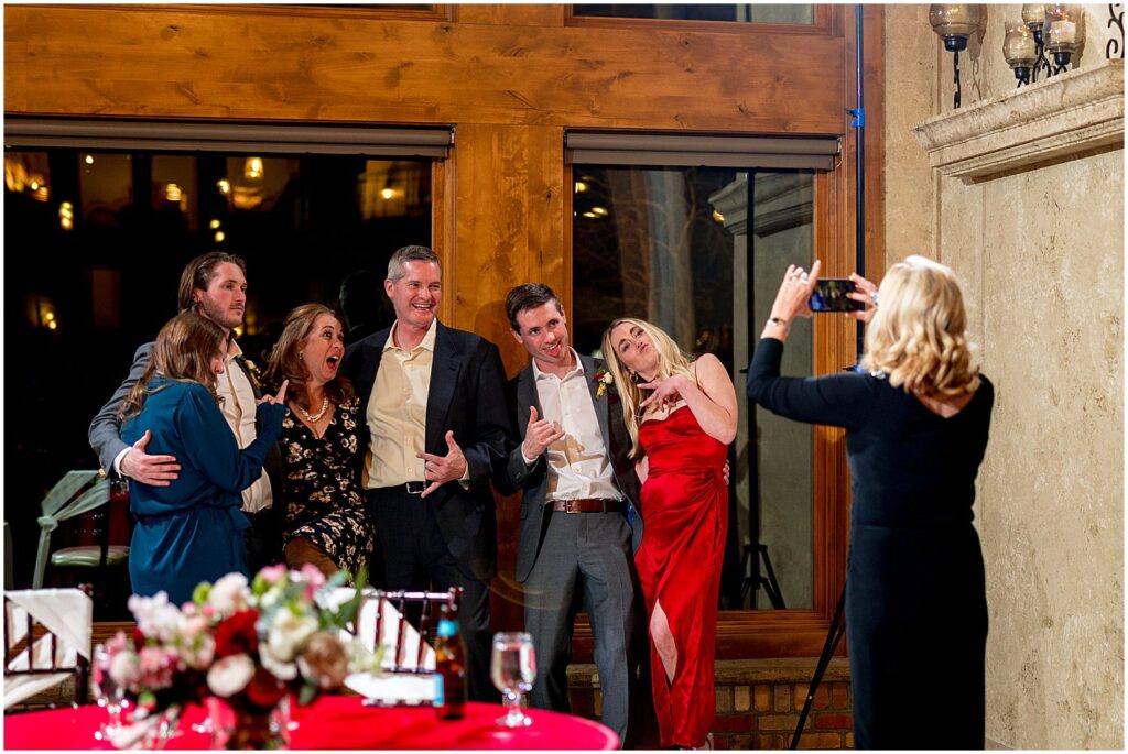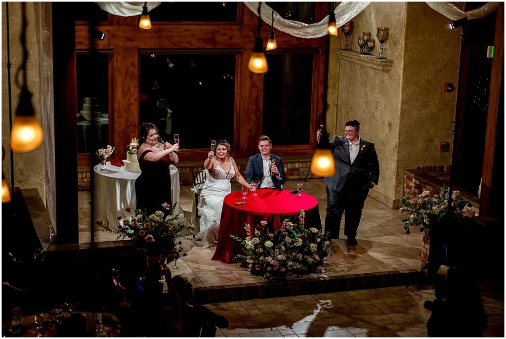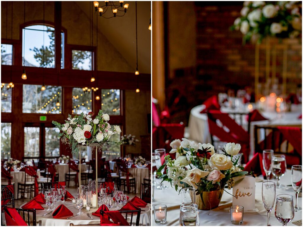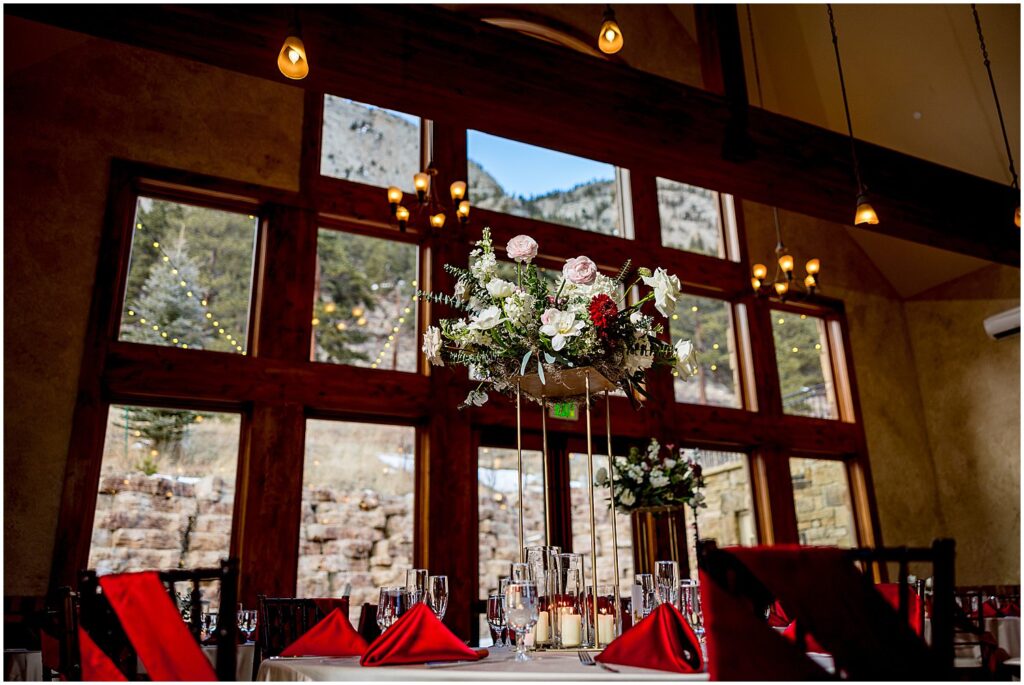 The reception began with a cocktail hour where guests were treated to hot coffee, or the naturally warming effects of an alcoholic beverage, along with a selection of hors d’oeuvres. The guests mingled and chatted on the upper floor, taking in the stunning views of the mountains and winter wonderland outside.