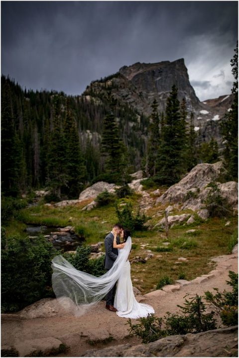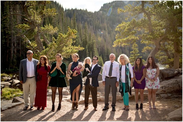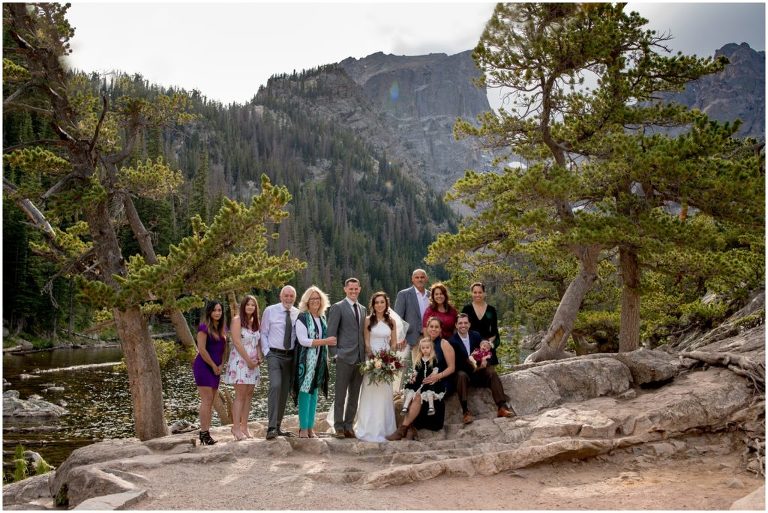 On the day of their elopement, Jenna and Ben headed up the trail with their closest family members in tow. Even the baby joined us on the hike up to Dream Lake. We spent a little time getting ready and taking photos with Hallet peak in the background. The weather was amazing, and we were graced with some clouds that made for an incredibly epic background.