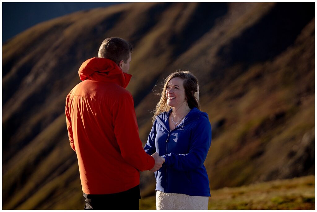 We spent the next hour or so for portraits, taking breaks between spots to warm up. Just before heading down to meet their family and friends at Pass Lake, Jenna and James took a few moments to say personal vows to one another in private overlooking out onto Torrey’s peak.