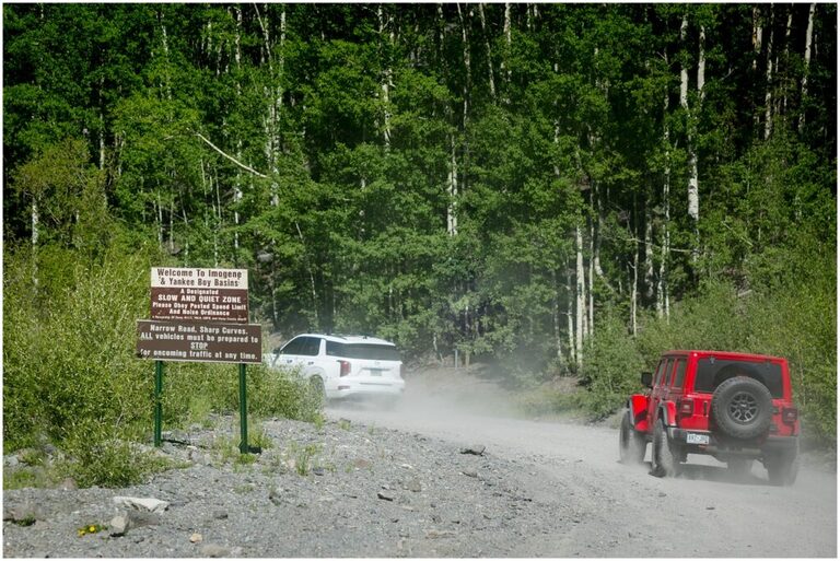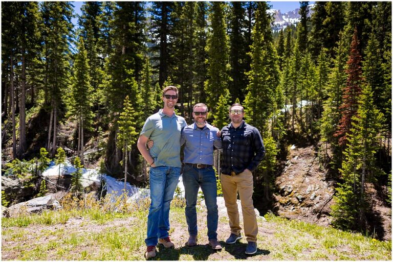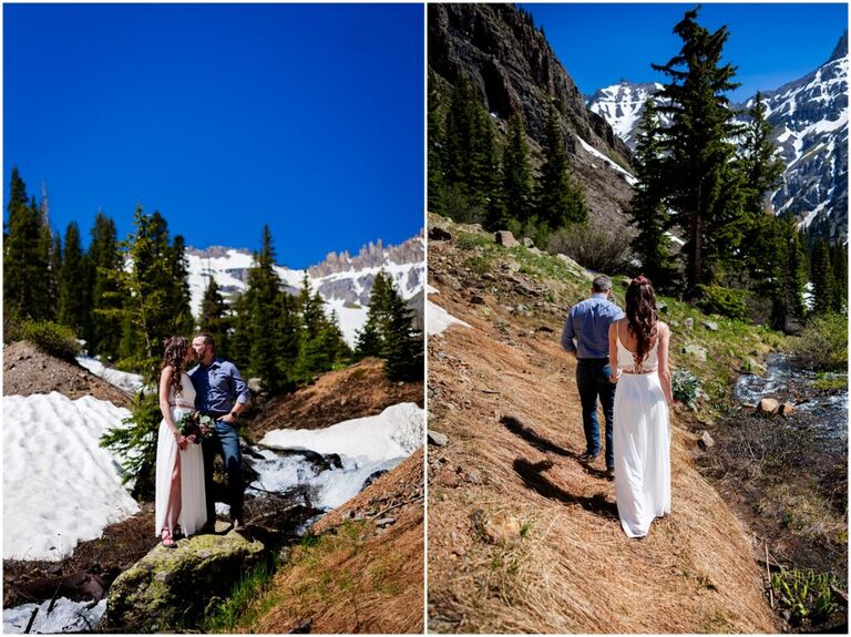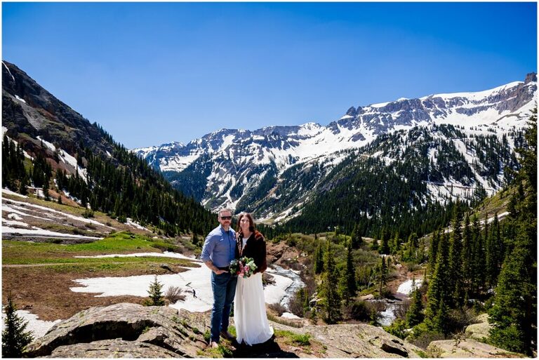 Originally, we had all talked about heading over Imogene pass into Telluride after their elopement, as everyone was staying in the nearby town.  2023 had other plans for anyone looking to 4×4, or adventure at higher altitudes, into late summer.  Rikki and Ethan’s elopement was at the very end of June – and there was still MASSIVE amounts of snow and very large snow banks blocking all the roads leading higher.  We went to go take photographs in Governor Basin, a side road that leads to higher alpine views, but there was a 10-12 ft snow bank still covering the entire road about 1/4 mile in.  Just goes to show – Colorado weather patterns be CRAZY.