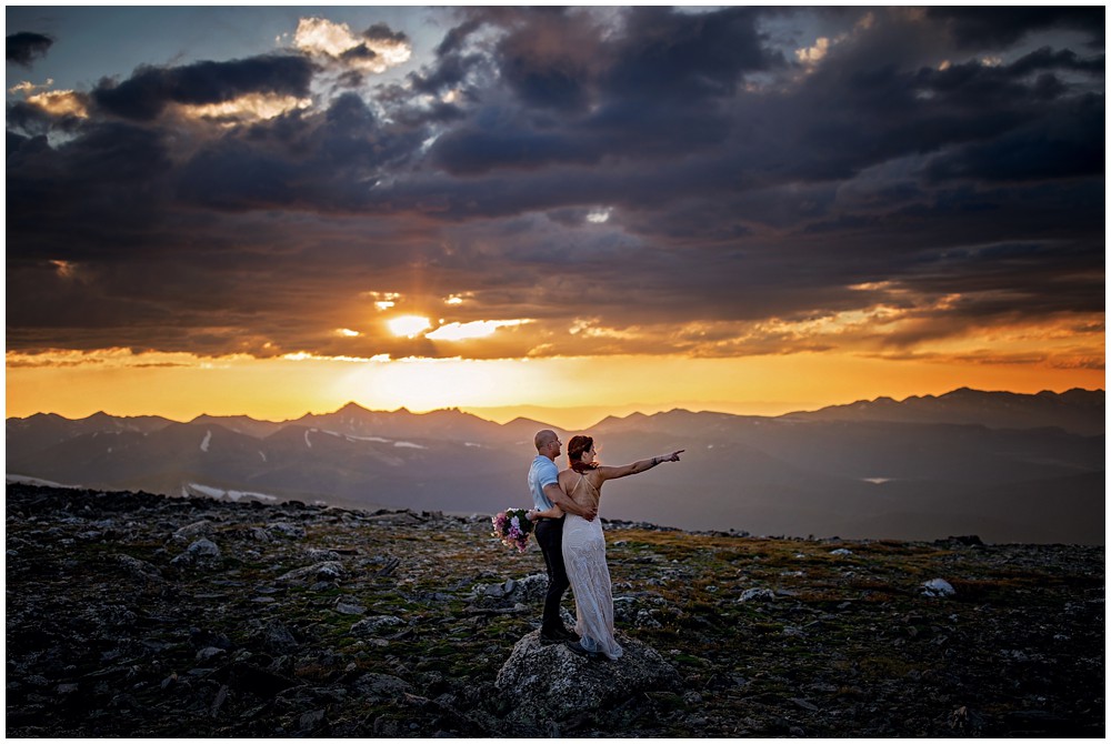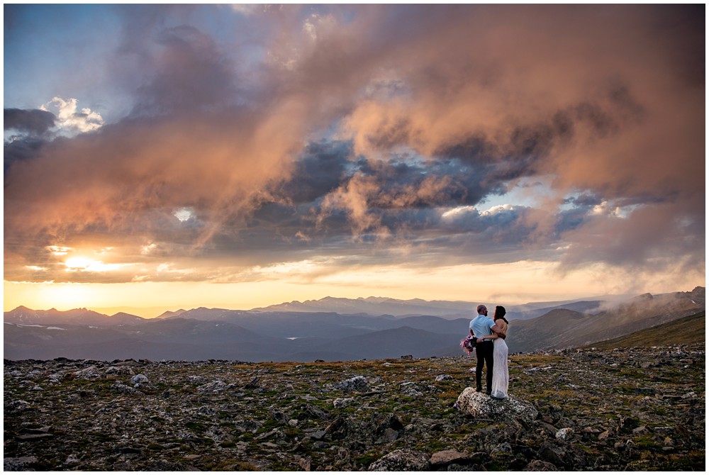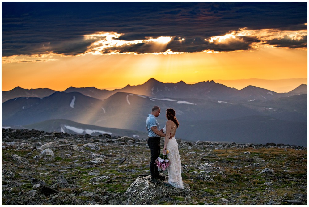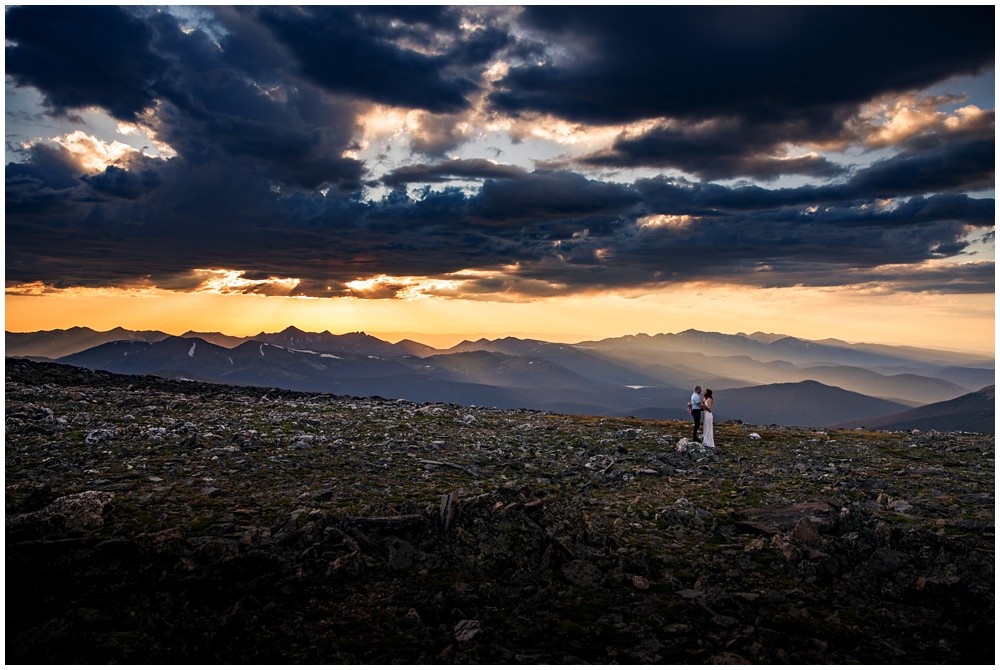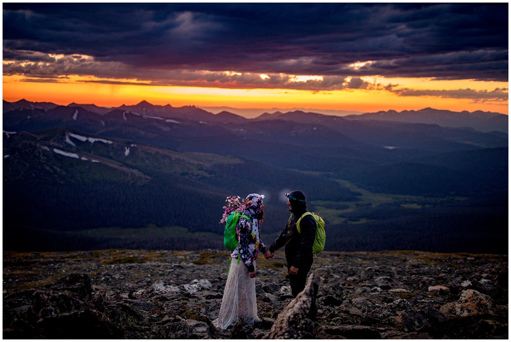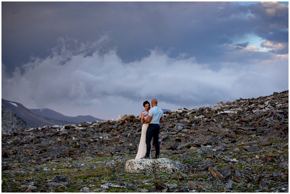 The approach to the summit was rather mild, and we made it to the storm shelters just as the sky was starting to turn magical colors. Amber headed in one direction to change into her attire, and Adam the other. Once they saw one another and were ready to say their vows above 13,000 feet, I told them to find a rock that sung to their souls – and that’s where we’d have their ceremony at. I personally am a huge proponent of finding a piece of Earth that speaks to you – you find the spot, and I’ll adjust myself accordingly.