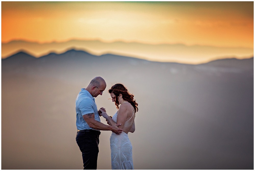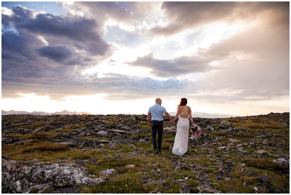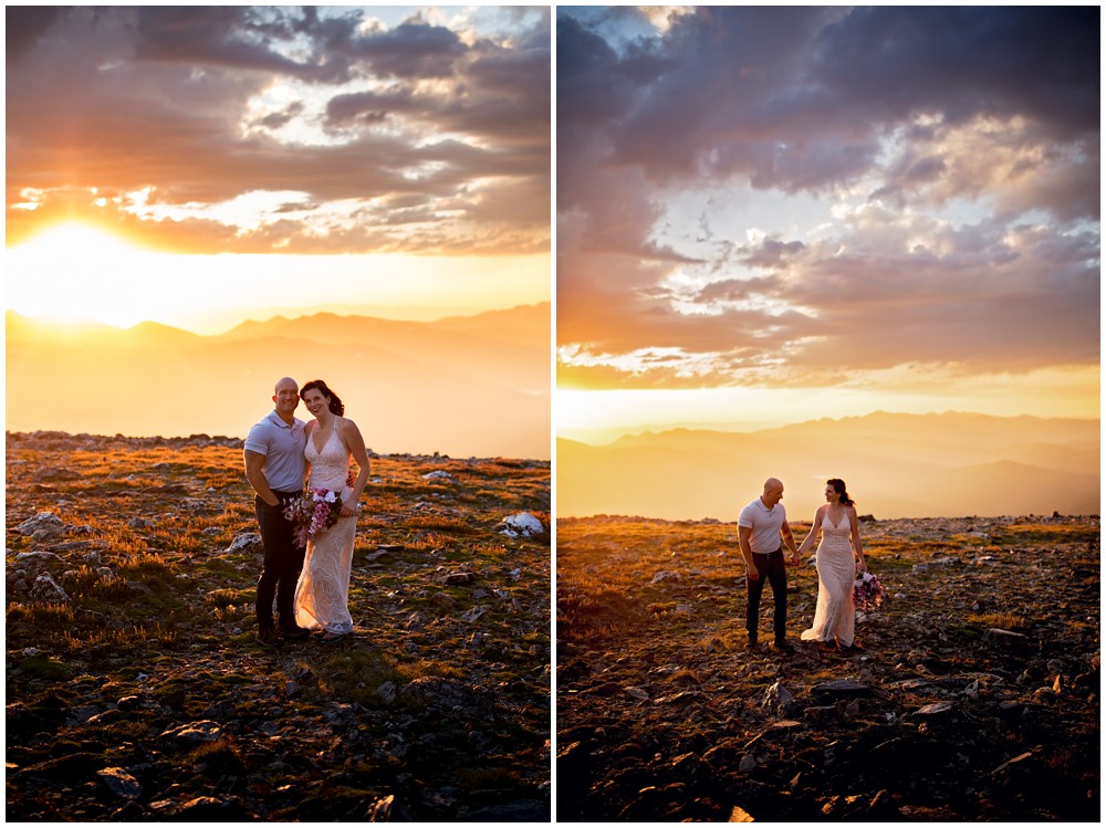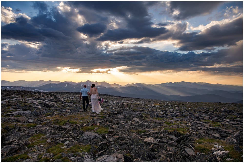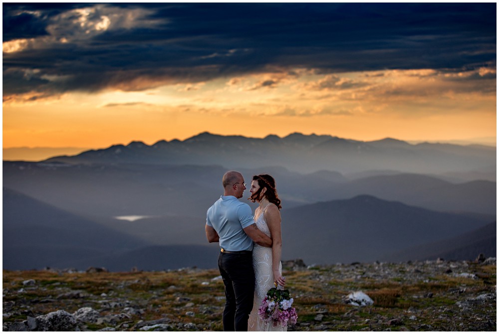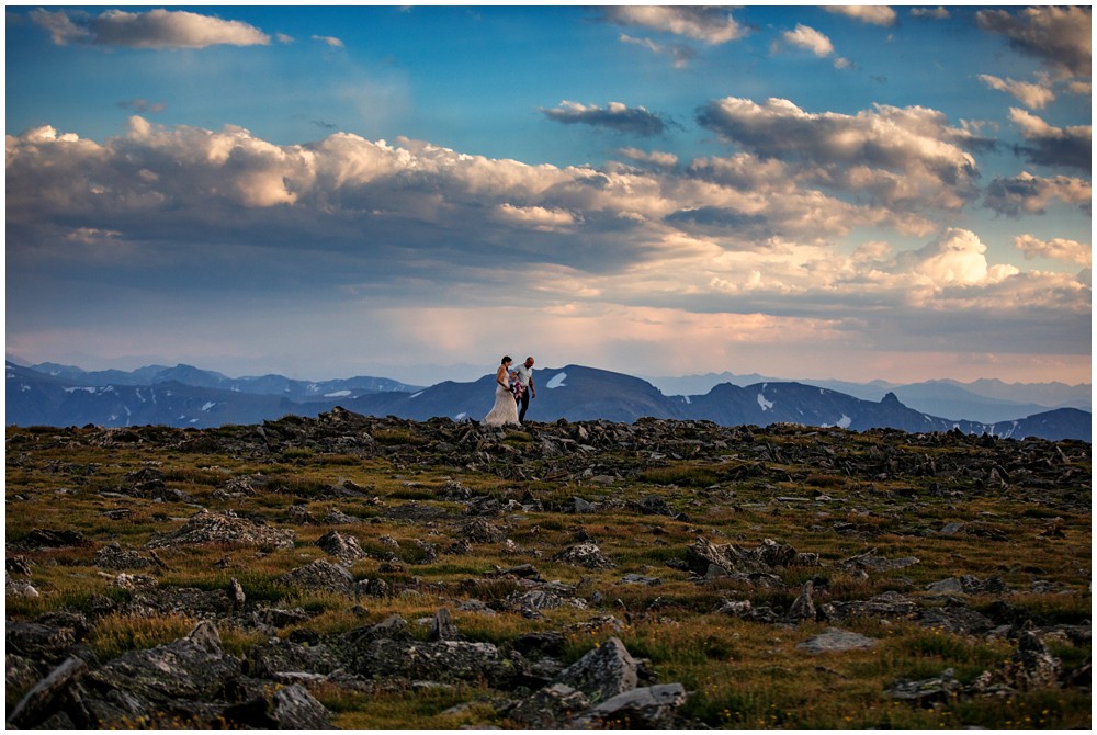 The approach to the summit was rather mild, and we made it to the storm shelters just as the sky was starting to turn magical colors. Amber headed in one direction to change into her attire, and Adam the other. Once they saw one another and were ready to say their vows above 13,000 feet, I told them to find a rock that sung to their souls – and that’s where we’d have their ceremony at. I personally am a huge proponent of finding a piece of Earth that speaks to you – you find the spot, and I’ll adjust myself accordingly.
