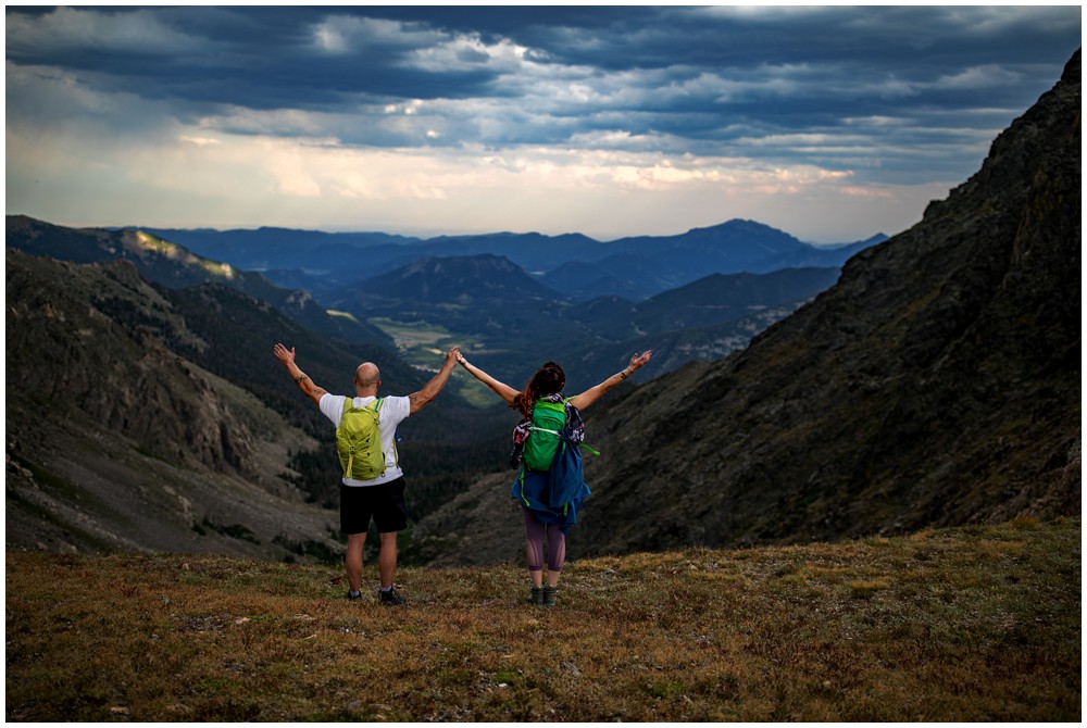As we were making our way up to the summit, Amber and Adam told us some pretty crazy stories about their time in Colorado. In Amber’s words, they’re “Believers”. They had met a woman on the hike to Sky Pond the day prior, who randomly approached them. This woman let them know that she was expecting to see them, as she had a dream that the male would be carrying the female across a threshold during their time in Colorado. Mind you, this was before Amber and Adam let her know that they were here in Colorado to Elope. We knew, that at some point during their mountain top elopement, Adam would have to pick up his new wife.